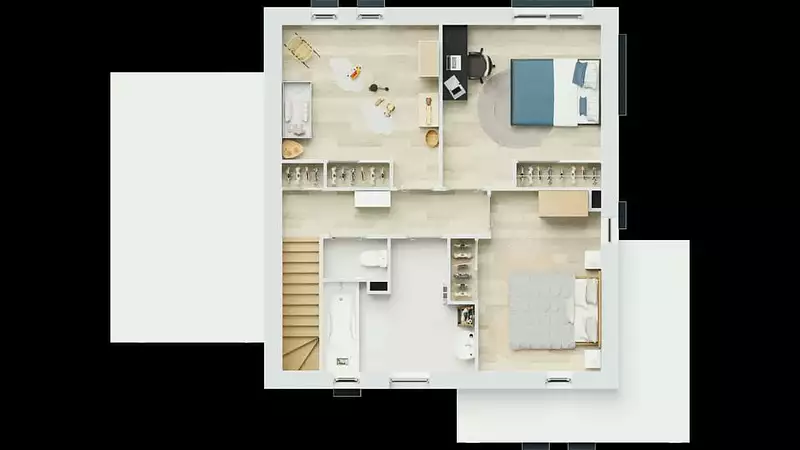 À l'intérieur, le Montmartre est conçu pour le confort et la fonctionnalité. Il dispose de 3 chambres spacieuses et d'une vaste pièce de vie ouverte, idéale pour des moments conviviaux en famille ou entre amis. La dalle béton à l'étage assure une isolation phonique et thermique optimale, renforçant le confort de vie au quotidien.