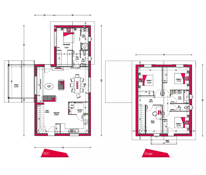 ce projet comporte trois chambres dont une de plain pied, deux salles d'eau et un grand balcon à l'étage.