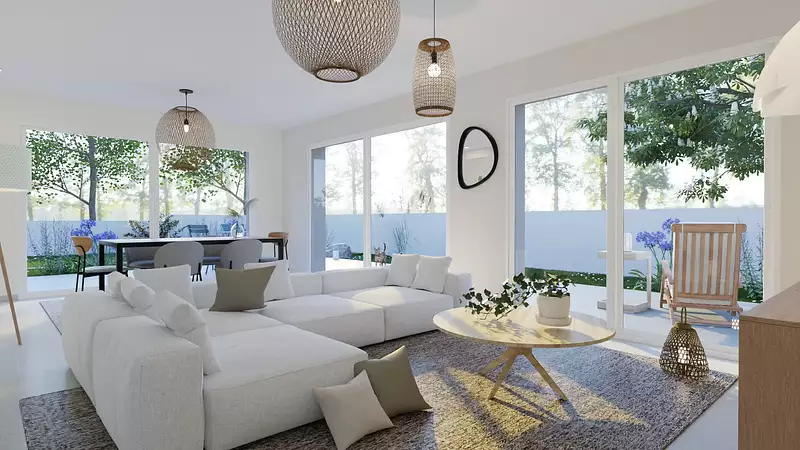 Une grande pièce à vivre baignée de lumière grâce aux larges ouvertures, ouverte sur la terrasse et le jardin, pour des moments de partage en famille.