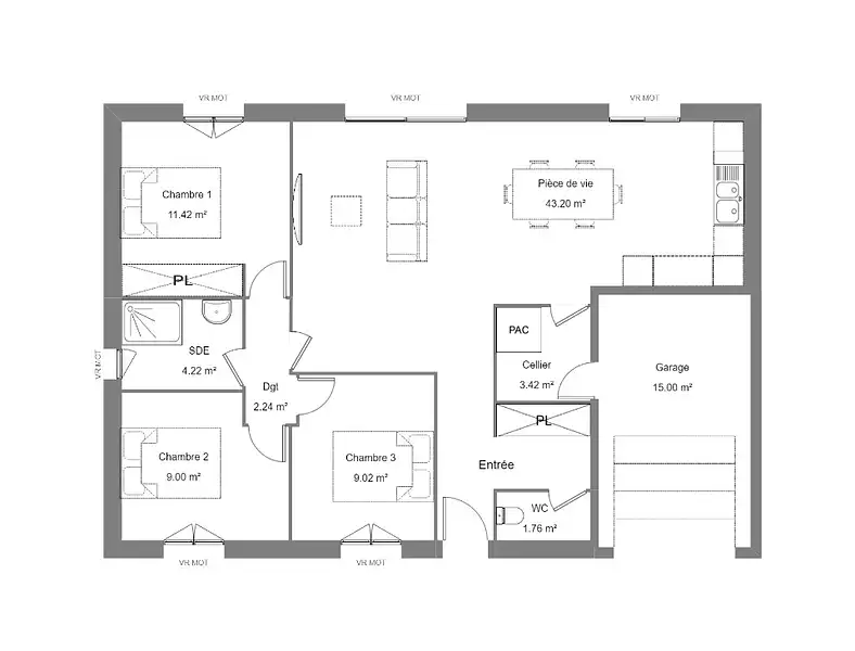 Côté prestations : Pompe à chaleur avec plancher chauffant, Menuiseries RAL 7016, combles aménageables