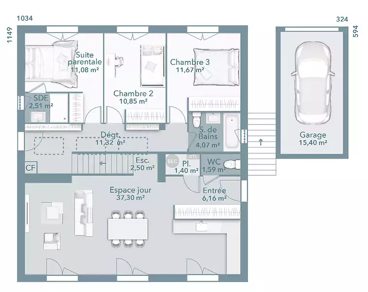 Proposée par MAISONS FRANCE CONFORT – 5 pièces - 3 chambres - terrain 750 m²