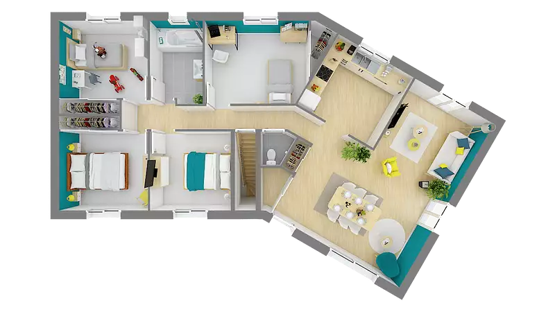 Sur ce terrain, nous vous proposons cette maison neuve : la Versière. Avec ses 92 m² de surface habitable, cette maison de plain-pied se distingue par son plan en V, offrant un brin d’originalité et une grande habitabilité. Elle dispose de 3 chambres et de 4 pièces, parfaitement adaptées pour une famille.
