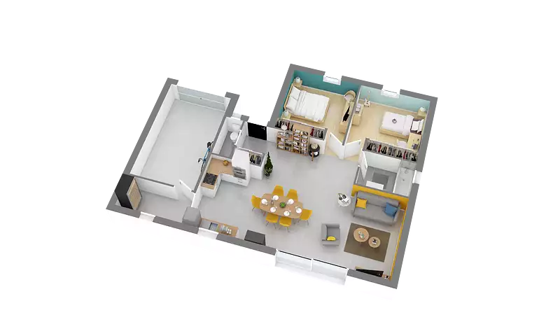 Compacte et fonctionnelle, cette maison de plain-pied vous propose un bel espace de vie lumineux, avec une grande baie vitrée donnant sur le jardin. Sa cuisine est ouverte sur le séjour et dispose d'un accès direct au cellier, et au garage intégré. Son espace nuit est composé de deux chambres avec rangements, d'une salle de bains et de wc séparés. Pour vous assurer un confort de vie et conformèment à la RE2025, nous avons chosi un mode de chauffage par PAC + plancher chauffant, volets roulants électriques, Prix hors fourniture et pose : des appareils sanitaires (sauf système de chauffage et d'eau chaude sanitaire), du carrelage et de la faïence, des revêtements de sol dans les chambres. Hors décoration et aménagement intérieur et peinture. Hors raccordements, frais de notaire et dommage ouvrage.
