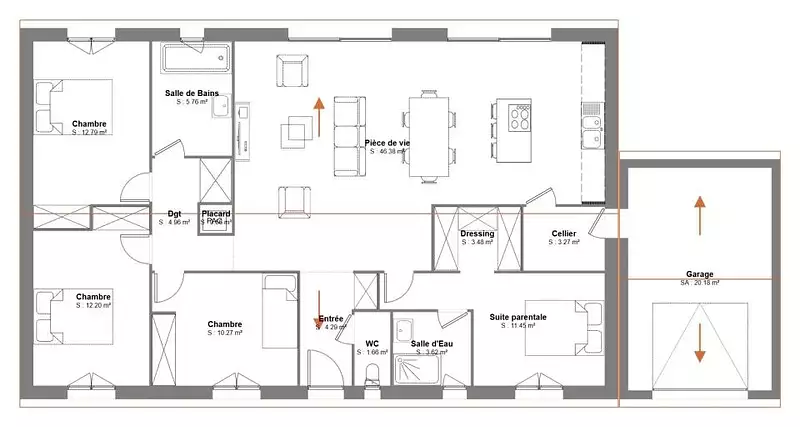 Cette villa se compose d'un bel espace de vie avec une cuisine ouverte, un cellier, 4 chambres dont une suite parentale avec sa salle d'eau privative et son dressing, et une seconde salle de bains qui vient complété ce bien. Vous aurez la possibilité d'y ajouter un garage si vous le souhaitez.
