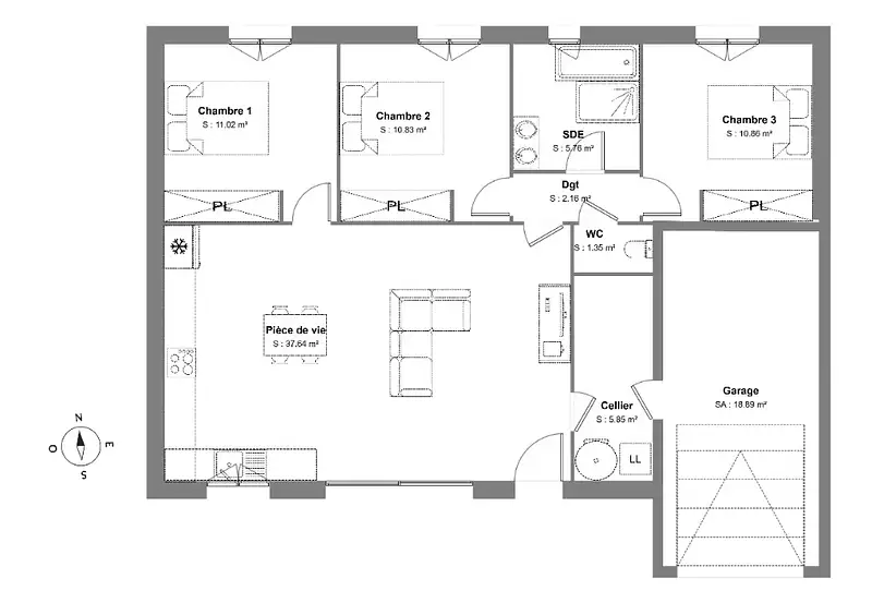. (Plan personnalisable). Tous nos ouvrages sont réalisés sur-mesure en fonction de vos attentes et de nos échanges avec vous ainsi que dans le respect de la règlementation RE 2020. Ce projet comporte les garanties suivantes: Contrat de construction CCMI. Dommage/Ouvrage. RC Garantie décennale. Parfaite achèvement. Etude de sol G2. Prix et délais convenu. Garantie de livraison. Garantie financière Pour votre tranquillité nous nous occupons de toutes les formalités administratives.