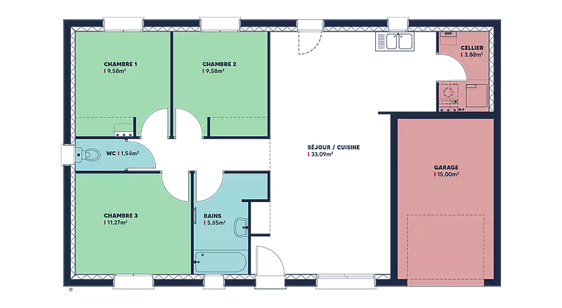 La Focus Cosy se distingue par son design contemporain et ses finitions soignées. Avec ses 4 pièces, dont 3 chambres, cette maison de plain-pied offre un espace de vie bien pensé et harmonieux. Le vaste séjour-cuisine est un lieu convivial où il fait bon vivre, tandis que l'espace nuit garantit tranquillité et intimité.