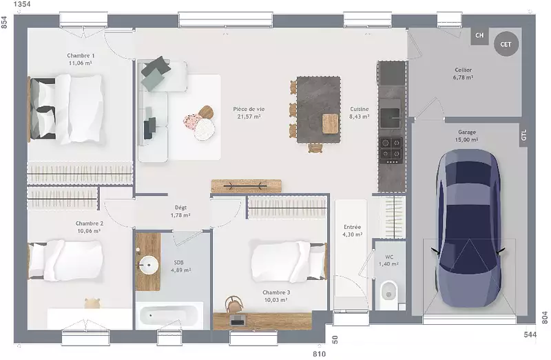 Emplacement privilégié - Maison neuve 5 pièces en vente à Bailleul-sur-Thérain (60930) avec une surface de 80 m² et de 483 m² de terrain. Conçue de plain-pied, elle offre trois chambres, une cuisine et une salle de bains.
