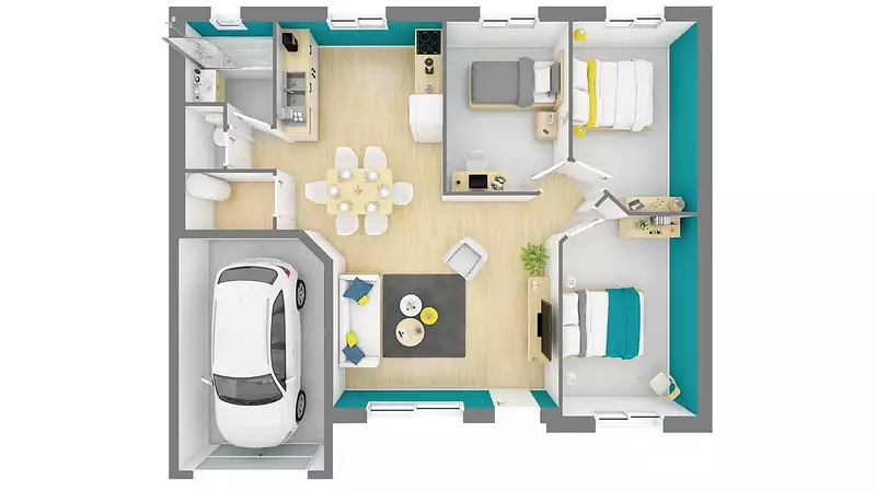 La Focus Tiny Sud, avec une surface habitable de 73 m², se distingue par son design sobre et moderne. Elle comprend 4 pièces, dont un grand séjour-cuisine traversant qui procure une agréable sensation d’espace, ainsi que 3 chambres à coucher de dimensions raisonnables, idéales pour accueillir votre famille.