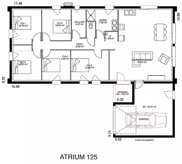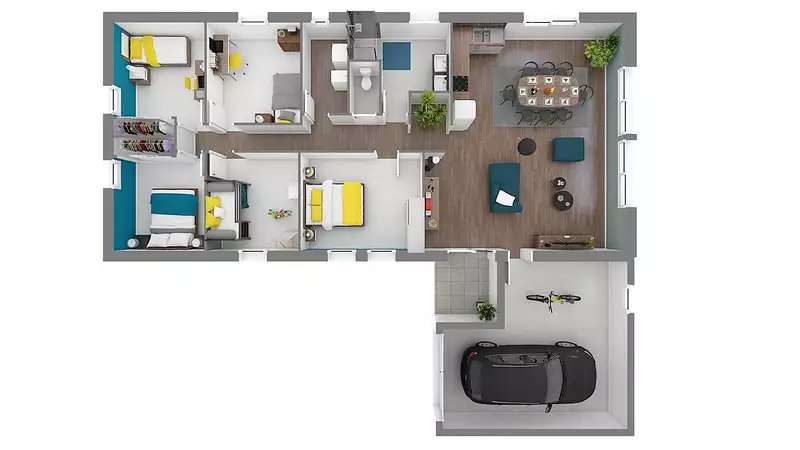 Le modèle ""Ambre"" intègre un garage, solution pratique et esthétique, qui s'harmonise parfaitement avec l'architecture globale de la maison. Ce garage intégré offre non seulement un espace de stationnement sécurisé pour votre véhicule mais aussi un accès direct à l'intérieur pour plus de commodité.
