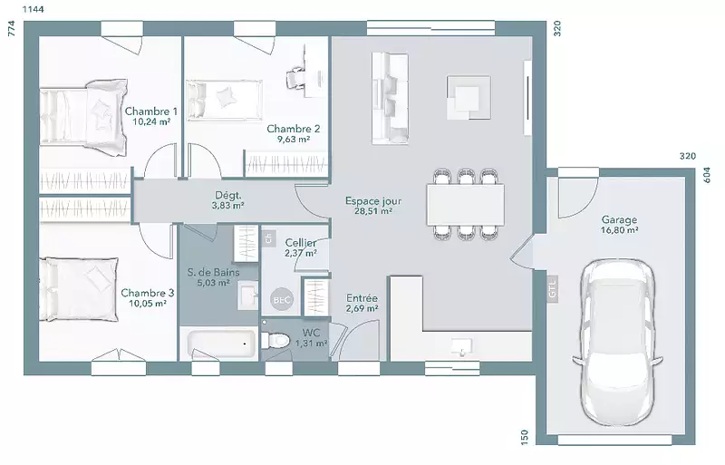 Proposée par MAISONS FRANCE CONFORT – 4 pièces - 3 chambres - terrain 297 m²
