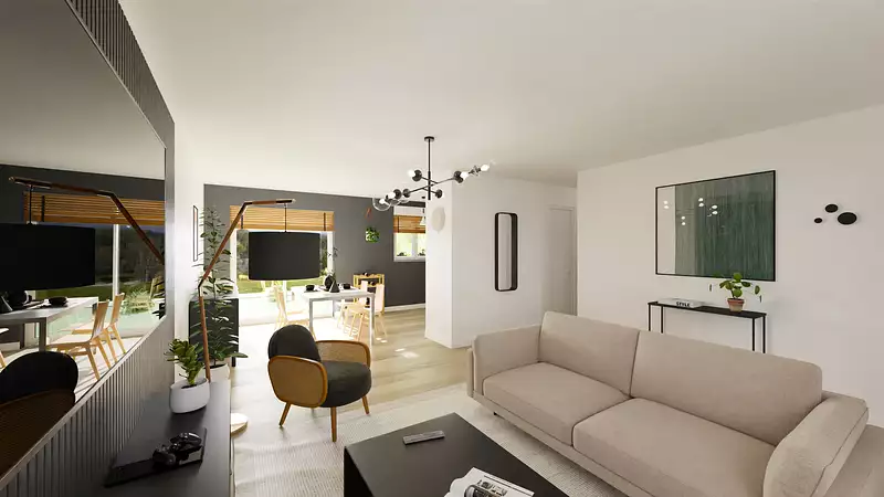 Un vaste séjour traversant avec cuisine ouverte sur le jardin, parfait pour recevoir ou partager des moments conviviaux.