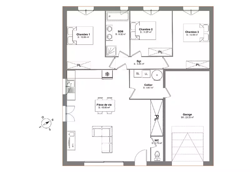 . (Plan personnalisable). Tous nos ouvrages sont réalisés sur-mesure en fonction de vos attentes et de nos échanges avec vous ainsi que dans le respect de la règlementation RE 2020. Ce projet comporte les garanties suivantes: Contrat de construction CCMI. Dommage/Ouvrage. RC Garantie décennale. Parfaite achèvement. Etude de sol G2. Prix et délais convenu. Garantie de livraison. Garantie financière Pour votre tranquillité nous nous occupons de toutes les formalités administratives.