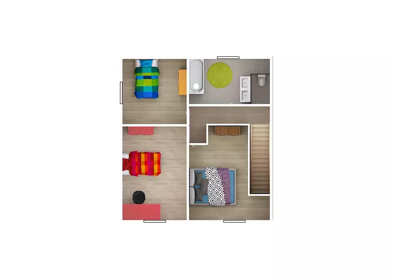 La pièce de nuit est répartie en 3 chambres dont 2 de 13m² et une de 10m² ainsi qu’une salle de bain avec baignoire ou douche au choix, un lavabo et un WC séparé.