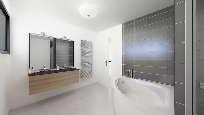 L'étage est conçu pour offrir à chaque membre de la famille son propre espace. Une grande mezzanine permet de créer un coin bureau ou un espace détente. Les deux chambres à l'étage mesurent chacune plus de 15 m² et disposent de leur propre dressing intégré. La salle de bains familiale permet d’accueillir un double vasque, une baignoire et une douche.