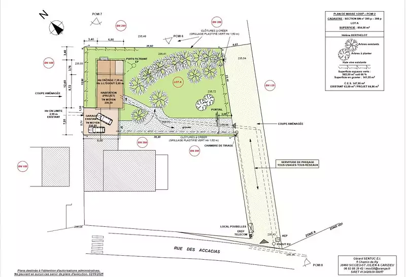 Le terrain plat fait 854 m² (LOT A), il est issu d'une division parcellaire.