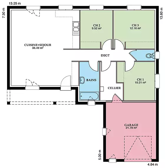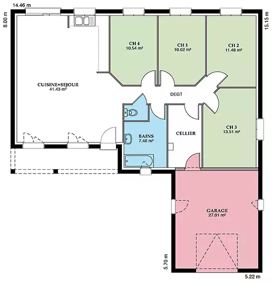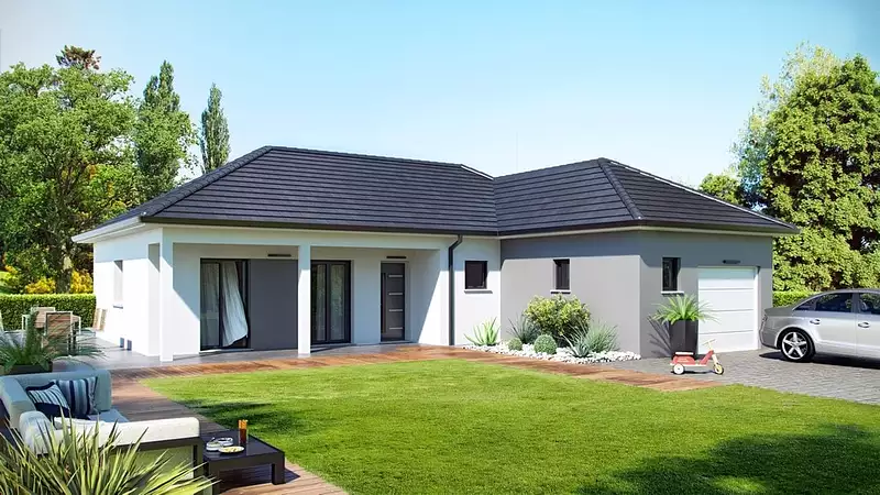 La ""Sauvetière"" se distingue par son garage accolé, une solution pratique qui optimise l'espace et facilite l'accès à la maison, tout en offrant un espace supplémentaire pour le rangement ou pour abriter votre véhicule. La configuration en L de la maison n'est pas seulement esthétique; elle permet également de délimiter naturellement l'espace extérieur, créant ainsi un cocon d'intimité pour votre jardin ou votre terrasse.