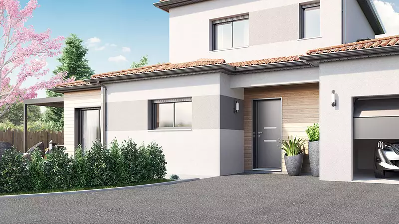 Une maison moderne et astucieuse, prête à accueillir vos projets de vie !. Laissez-vous séduire par cette charmante maison à étage conçue pour allier confort et fonctionnalité. Son vaste espace de vie de plus de 42 m², baigné de lumière, s’ouvre sur l’extérieur pour des moments de convivialité en famille. Profitez du confort d’une suite parentale avec dressing et salle d’eau au rez-de-chaussée, offrant intimité et praticité. À l’étage, deux belles chambres et une salle de bains complètent cet espace pensé pour toute la famille. Un garage de plus de 23 m² vient parfaire ce bien, idéal pour allier rangement et stationnement. Une maison moderne et astucieuse, prête à accueillir vos projets de vie !. Pour un confort optimal et conforme à la RE2025, cette maison dispose d’une PAC avec plancher chauffant au rez-de-chaussée, radiateurs à l’étage et volets roulants électriques. À noter : Le prix indiqué exclut les revêtements de sol des chambres, la cuisine aménagée, la peinture, la décoration, les raccordements, les frais de notaire et l’assurance dommages-ouvrage. (Carport non contractuel, non compris dans le prix).