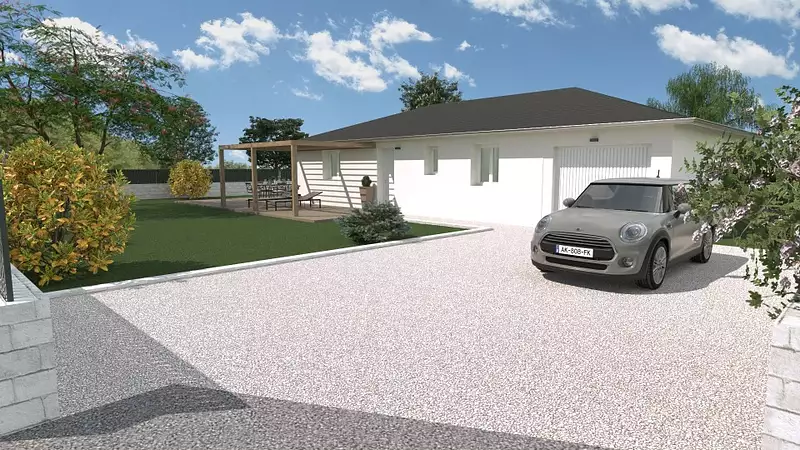 Cette maison de plain-pied de 90 m² est composée d'un bel espace de vie très lumineux grâce à une grande baie vitrée,
