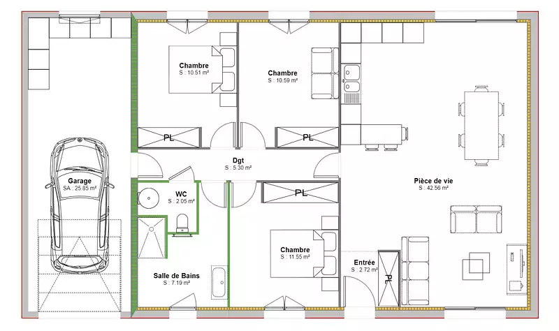 Le projet comprend une maison d’environ 90 m² habitables, fonctionnelle et lumineuse, implantée sur un terrain de 585m², idéale pour une vie de famille sereine.