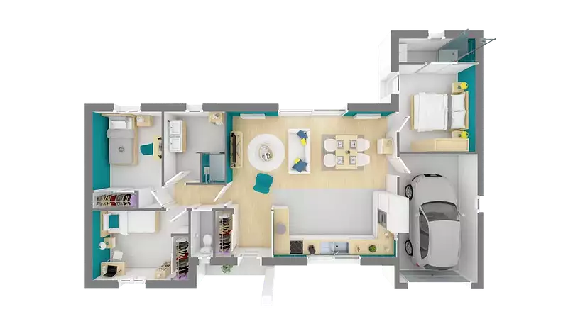 Les caractéristiques principales de la maison AGONA incluent des baies coulissantes qui inondent le salon-séjour de lumière naturelle, une suite parentale avec salle de bains privative pour plus d'intimité, et un garage intégré pour un stationnement pratique.