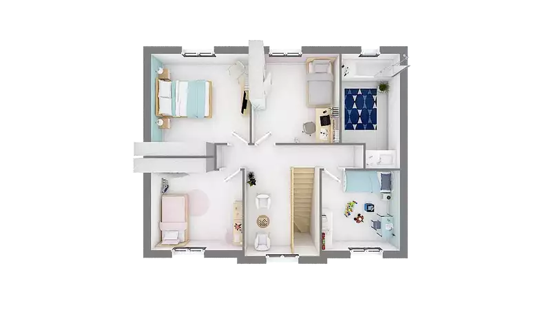 L'étage de la maison BAHAMAS est tout aussi bien pensé, avec quatre chambres allant de 10 à 13 m², permettant à chaque membre de la famille de bénéficier de son propre espace personnel, ou d'accueillir confortablement vos invités. La salle de bains, spacieuse de plus de 8 m², est conçue pour faciliter le quotidien des familles actives, complétée par un second WC indépendant pour une meilleure fonctionnalité.