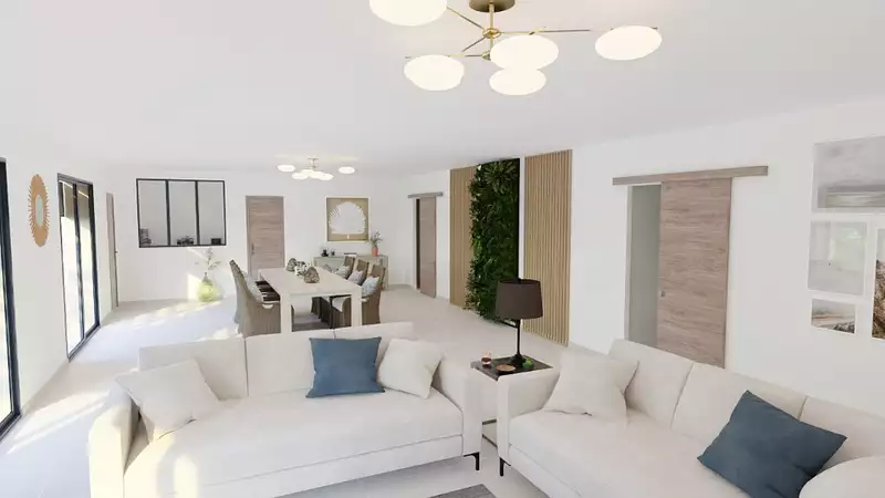 Maison contemporaine et provençale. Possibilités de jouer avec les toitures. Au rez-de-chaussée, vous trouverez 4 chambres avec une salle d'eau, une suite parentale complète avec dressing et salle d'eau privative. 1 WC séparé, une cuisine fermée avec verrière et une belle pièce de vie de 60 m² avec cellier communiquant au garage 38 m² en toiture terrasse végétalisé.