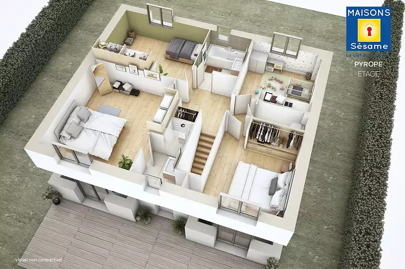 À l’étage, les quatre chambres sont bien agencées, dont une suite parentale avec sa propre salle de douche. Ce modèle combine élégance, fonctionnalité et confort pour répondre aux besoins d’une famille moderne.