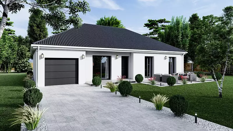 Cette maison de plain-pied se distingue par son design soigné, avec un porche accueillant qui rompt l'uniformité de la façade, offrant un abri de seuil de porte des plus pratiques. Le garage intégré ajoute une commodité non négligeable, facilitant votre quotidien tout en s'intégrant harmonieusement à l'ensemble architectural.