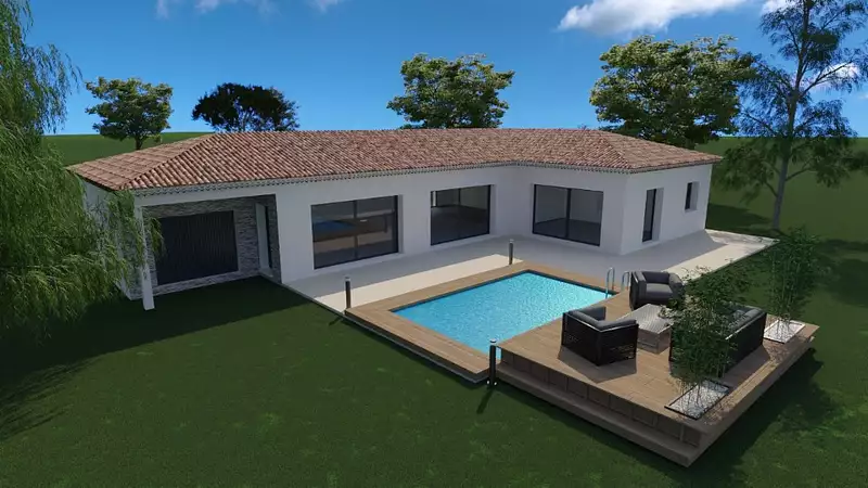 Grande villa contemporaine de plain-pied proposant 3 ou 4 chambres, 2 salles d'eau, dressing, cellier, entrée avec WC invités, très grande pièce à vivre ouvrant sur une belle terrasse et un garage accolé.
