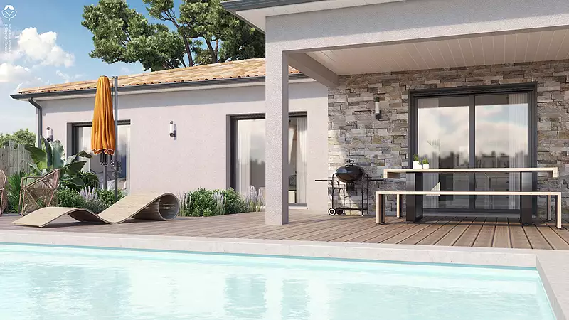 Charmante maison de plain-pied fonctionnelle avec garage, très lumineuse, qui saura vous séduire par ses beaux volumes. Un très bel espace de vie avec cuisine ouverte de plus de 63 m² baigné de lumière grâce à ses deux baies vitrées, accès direct sur la terrasse. Côté nuit, une suite parentale avec dressing, salle d'eau, 1 chambre avec salle d'eau privative et deux chambres avec salle de bains. Pour vous assurer un confort de vie et conformément à la RE2025, nous avons choisi un mode de chauffage par PAC + plancher chauffant, volets roulants électriques. Prix hors peinture, décoration, revêtements de sol dans les chambres, cuisine équipée), frais de notaire, raccordements, dommage ouvrage. (Piscine non contractuelle, non comprise dans le prix).