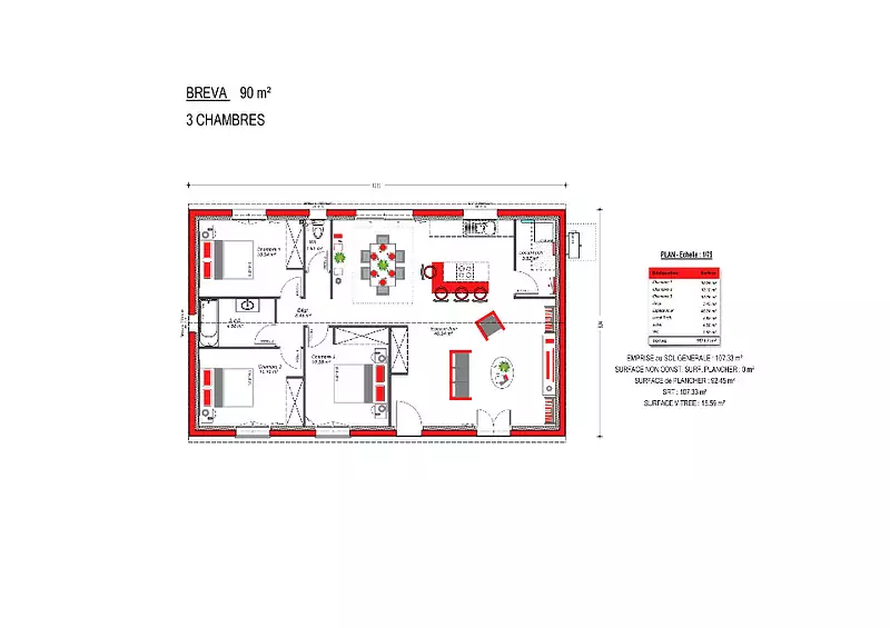 Chaque maison de 90 m² habitables comprennent :