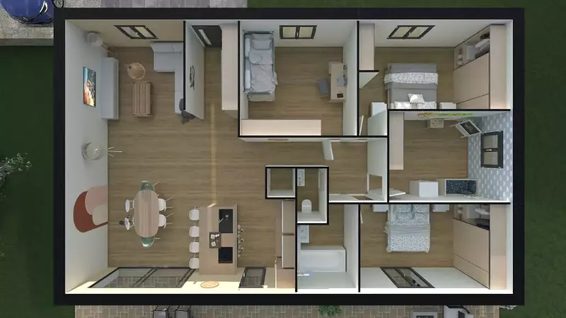 Nous vous proposons ce modèle de maison de plain-pied de type 5, d'une surface habitable de 110 m², pensé pour offrir confort, fonctionnalité et optimisation des espaces.