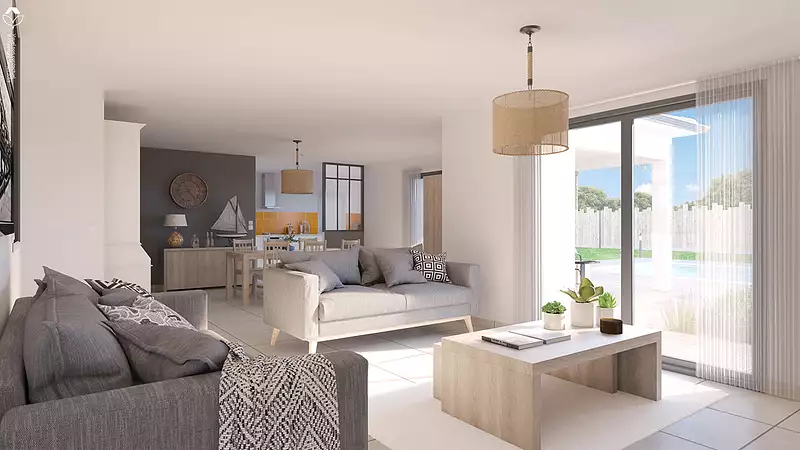 Charmante maison de plain-pied fonctionnelle avec garage, très lumineuse, qui saura vous séduire par ses beaux volumes. Un très bel espace de vie avec cuisine ouverte de plus de 63 m² baigné de lumière grâce à ses deux baies vitrées, accès direct sur la terrasse. Côté nuit, une suite parentale avec dressing, salle d'eau, 1 chambre avec salle d'eau privative et deux chambres avec salle de bains. Pour vous assurer un confort de vie et conformément à la RE2025, nous avons choisi un mode de chauffage par PAC + plancher chauffant, volets roulants électriques. Prix hors peinture, décoration, revêtements de sol dans les chambres, cuisine équipée), frais de notaire, raccordements, dommage ouvrage. (Piscine non contractuelle, non comprise dans le prix).