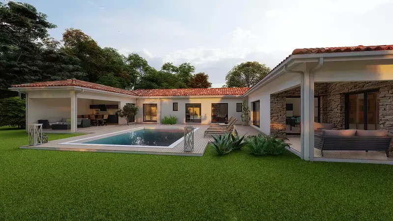 Cette maison de plain pied unique dans sa conception, vous offre une belle pièce de vie avec cuisine ouverte agrémentée d'une large baie vitrée pour optimiser la lumière naturelle, deux suites parentales avec salles d'eaux et dressings, 3 chambres et un bureau.