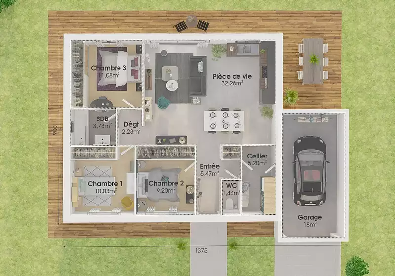 Maisons France Confort vous propose ce projet de maison plain-pied, pensée pour offrir confort, praticité et luminosité au quotidien, dans un cadre calme et agréable.