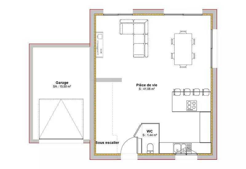 Au rez-de-chaussée, vous serez séduit par une grande pièce de vie ouverte de 42 m², lumineuse grâce à sa baie vitrée, offrant un accès direct au jardin. L’escalier ouvert mène à l'étage, et à l'entrée, vous trouverez une cuisine fonctionnelle ainsi qu'un WC séparé. Un garage de 15 m² complète ce niveau.
