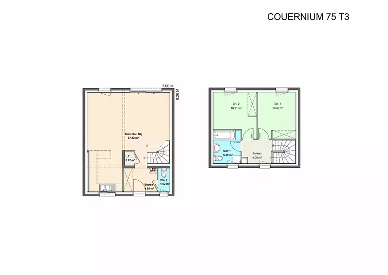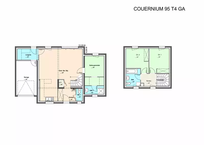 Plusieurs configurations possibles pour cette maison à étage. Déclinable en versions d’une superficie de 75 à 95 m², la Couernium vous offrira un look différent en fonction de vos choix. L’étage, dans les différentes configurations, se composera de deux chambres, d'une salle de bain avec baignoire, douche et WC.