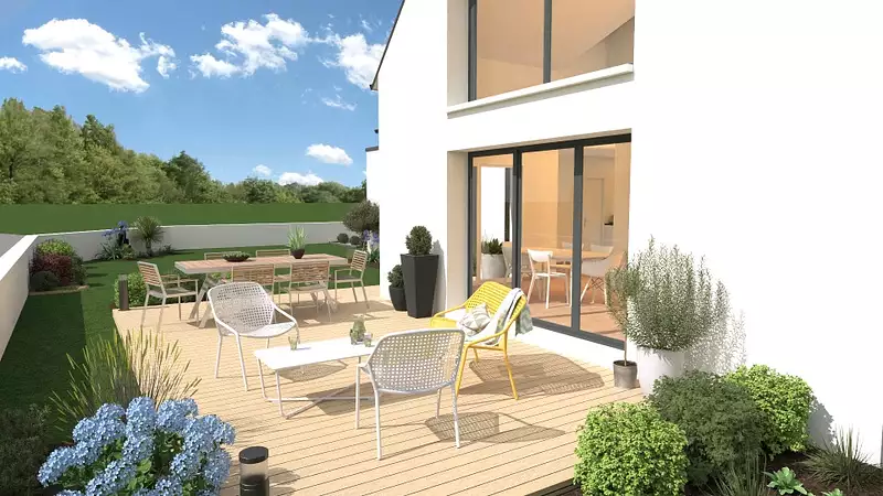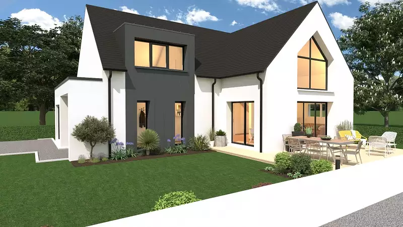 Proche de Rennes - En vente à Chantepie (35135) : maison neuve 5 pièces de 150 m² et de 459 m² de terrain. Son intérieur est composé de trois chambres, d'une cuisine et de deux salles de bains.