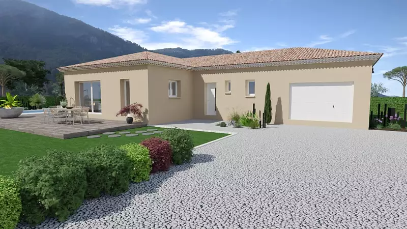 Maison de plain pied L de 120 m² habitables et ses 4 chambres, un espace de vie comprenant une cuisine ouverte. Projet entièrement personnalisable selon vos envies. Garage en option.
