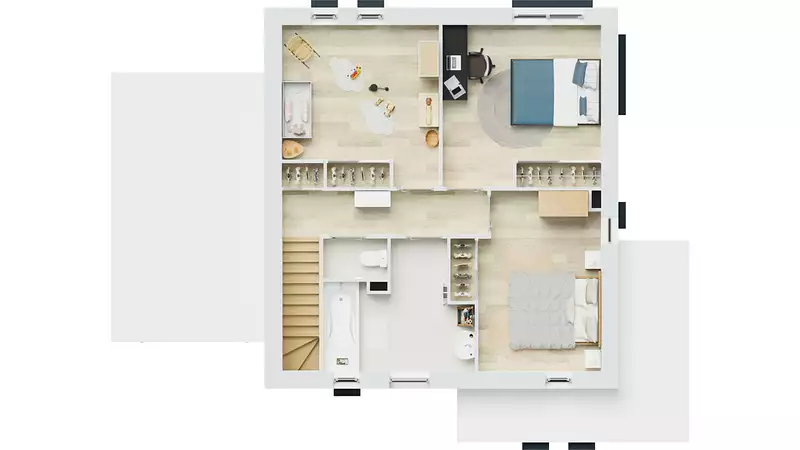 Cette maison contemporaine à étage, d’une superficie de 110 m², allie lignes traditionnelles et touches de design moderne pour créer une esthétique épurée et captivante. La VivaCity se distingue par son architecture compacte et son garage accolé à toit plat, offrant une intégration harmonieuse dans son environnement. À l'intérieur, la VivaCity est conçue pour le confort et la fonctionnalité. Elle dispose de 4 chambres spacieuses dont une belle suite parentale et d'une vaste pièce de vie ouverte, idéale pour des moments conviviaux en famille ou entre amis. La dalle béton à l'étage assure une isolation phonique et thermique optimale, renforçant le confort de vie au quotidien.