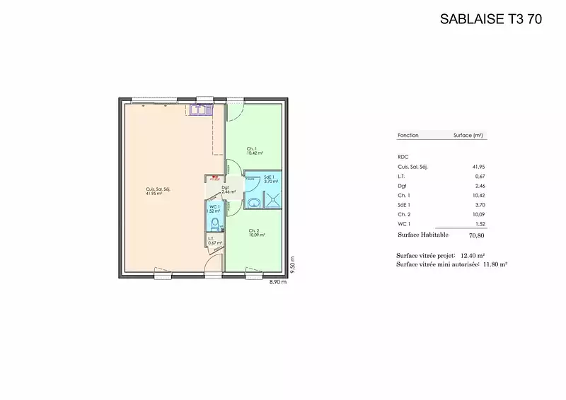La disposition intérieure de la Sablaise en fait une habitation à la surface optimisée. Il n’y a aucune place perdue ! Vous disposerez de deux chambres, d’un grand séjour avec cuisine ouverte. La salle d’eau, équipée d'une douche italienne, se situe dans l’espace nuit et les w.c. sont séparés.
