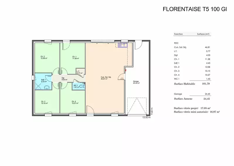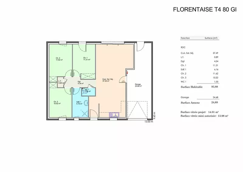 Les caractéristiques principales de cette maison incluent un garage intégré, une conception basse consommation et une cuisine ouverte. La Florentaise est conforme à la RE2020, garantissant une performance énergétique optimale et un respect des normes environnementales les plus récentes.