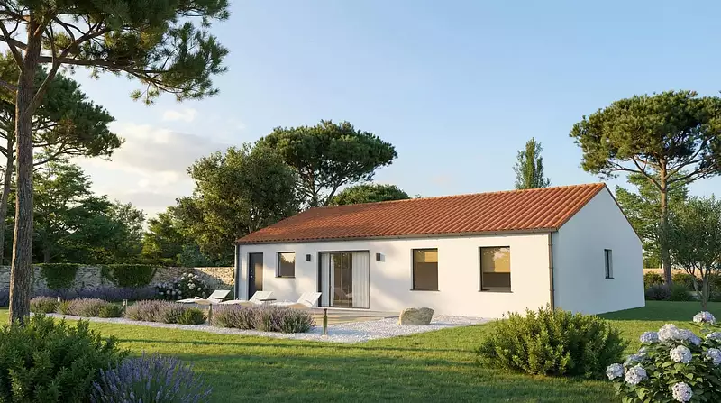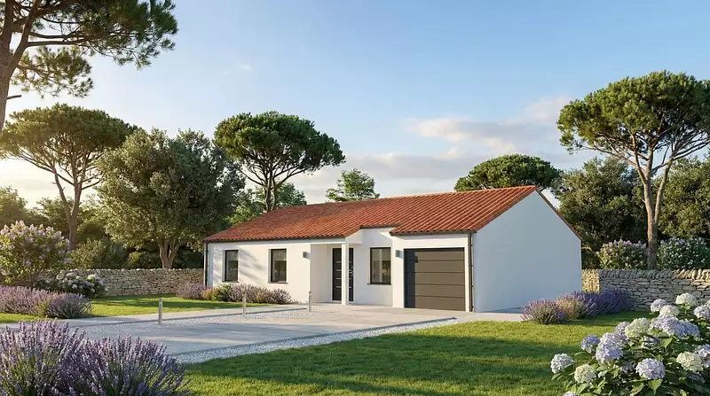 Cette maison de plain-pied est équipée d'un garage intégré et d'un auvent, alliant praticité et élégance. Vous pouvez personnaliser la Rochelaise selon vos goûts : optez pour des volets battants de couleur pour un look traditionnel ou des enduits de couleurs différentes et des menuiseries en aluminium pour un style plus moderne.