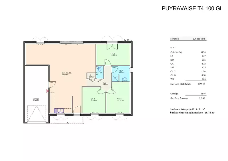Le modèle Puyravaise est une belle demeure tout en longueur. La Puyravaise est un joli plain-pied avec garage accolé, muni de volets battants de couleur et d’un auvent aussi pratique qu’élégant, d’une dimension qui lui permet de couvrir non seulement l’entrée, mais également la porte-fenêtre du séjour.