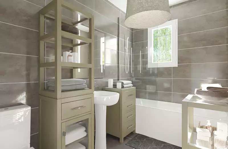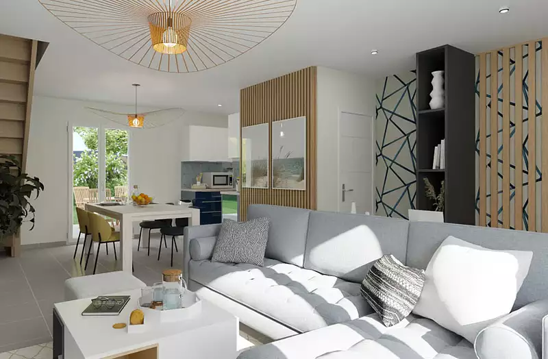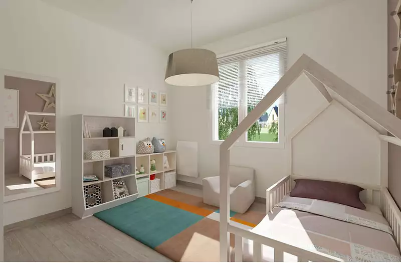 ECLAT est une maison à étage d'une surface totale de 90 m2. Elle est construite sur vide sanitaire et propose au rez-de-chaussée un séjour-cuisine de 35 m2, un WC et d'un garage intégré de plus de 13 m2 donnant accès cellier. L'espace nuit se situe à l'étage. Il se compose de 3 chambres de plus de 9 m2, d'une quatrième chambre avec dressing pour une surface totale de 12,5m2 et une salle de bains avec possibilité d'installer en option un WC. A noter, le garage est compatible avec un futur aménagement intérieur (hors point d'eau). Les menuiseries sont en PVC de couleur blanche, les volets sont quant à eux en bois prépeints en blanc. Plusieurs couleurs d'enduit extérieur sont proposées.