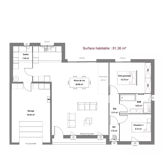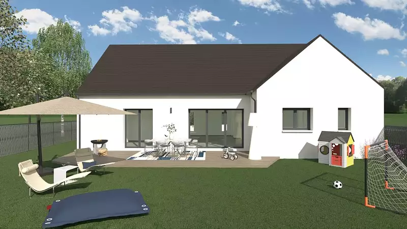 Cette maison offre un espace séjour de plus de 50 m² avec de grandes baies donnant sur votre futur jardin.