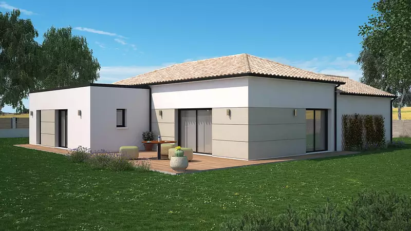 Un plan en L qui change tout !. Cette maison séduit au premier regard par son architecture en L, qui structure l’espace avec fluidité et caractère. L’espace de vie s’ouvre naturellement sur l’extérieur, baigné de lumière et prêt à accueillir vos moments de partage. Le coin nuit, bien séparé, propose 4 chambres confortables et deux salles d’eau pour une vie de famille tout en douceur. Le cellier attenant à la cuisine et le garage intégré ajoutent une touche de praticité au quotidien. Un modèle pensé pour s’adapter à toutes les envies, avec un vrai potentiel de personnalisation. . Pour un confort optimal et conforme à la RE2025, cette maison dispose d’une PAC avec plancher chauffant et volets roulants électriques. À noter : Le prix indiqué exclut les revêtements de sol des chambres, la cuisine aménagée, la peinture, la décoration, les raccordements, les frais de notaire et l’assurance dommages-ouvrage. .