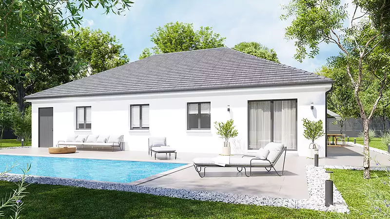 Véritable ""tout-en-un"" de la maison individuelle, ce modèle est idéal pour votre projet de construction sur-mesure. La Ménilière est disponible avec un toit à 2 pans ou 4 pans, selon vos préférences esthétiques. Le garage intégré et la galerie avant ajoutent une touche pratique et élégante à cette maison.