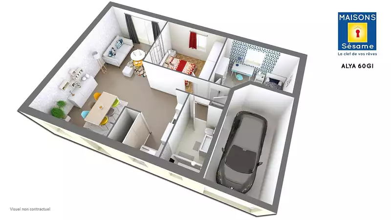 La maison ALYA 60 GI offre un cadre de vie confortable et fonctionnel dans un format compact et optimisé. Avec une surface habitable de 65 m², ce modèle est idéal pour un premier achat ou pour ceux qui recherchent une maison pratique et bien agencée.