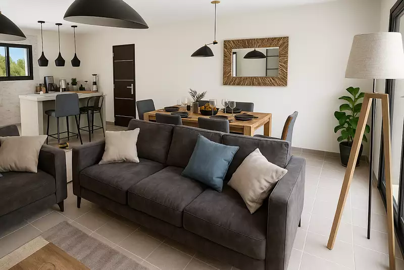 Implanté à Comps (30300), ce projet terrain + maison neuve de 86 m² à construire offre une solution idéale pour un premier achat ou un projet familial maîtrisé. Édifiée de plain-pied sur un terrain viabilisé de 440 m² situé dans un lotissement agréable, la maison bénéficie d’un environnement pratique avec les écoles, les transports et les commodités accessibles rapidement. De conception traditionnelle, elle propose une distribution fonctionnelle avec un espace de vie ouvert et lumineux intégrant une cuisine américaine, un cellier attenant, trois chambres confortables, une salle de bains et un toilette indépendant, le tout pensé pour un quotidien fluide et facile à vivre. Une opportunité cohérente pour concrétiser un projet de construction dans un secteur recherché, disponible chez Maisons Bati-France. Nous avons sélectionné ce terrain en partenariat avec nos aménageurs fonciers, dans le cadre d’un projet avec Maisons Bati-France.